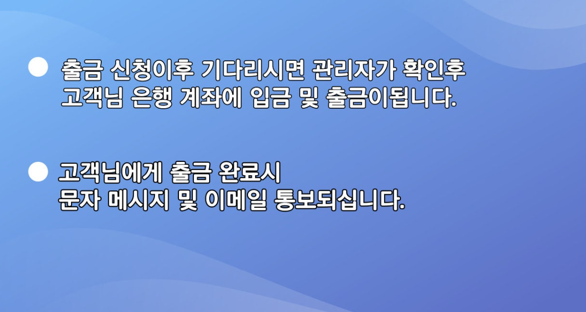 9. 입 출금 요청이후 1분에서 5분 정도 기다리시면 관리자 확인후