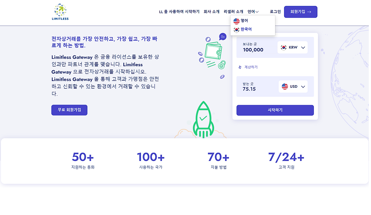 1. PG사 LIMITlLESS GATEWAY 메인 홈페이지 우측 상단 한국어 변경 후 회원가입 클릭.