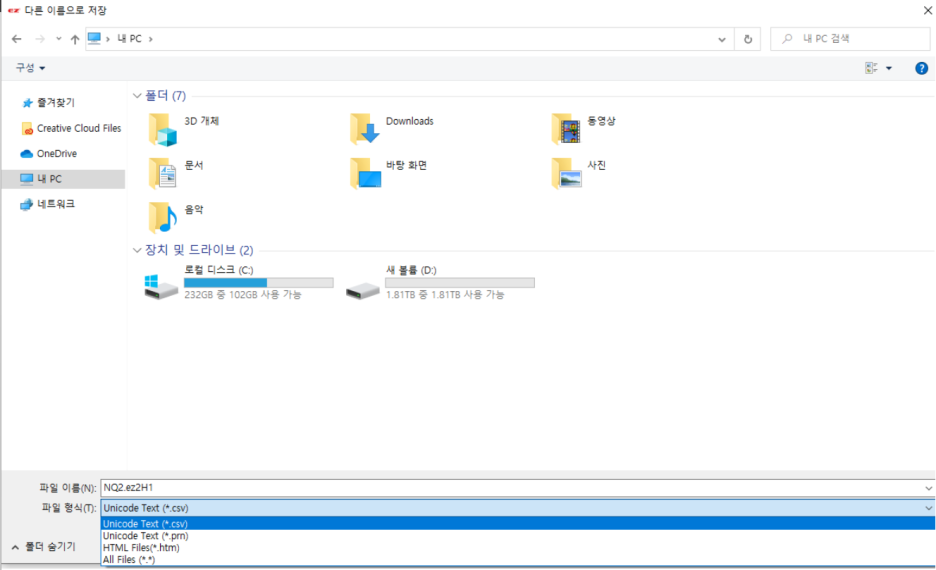 CSV 형식은 엑셀 파일, HTM 확장 형식, PRN 프린트 테이블 형식으로 저장 가능하십니다.