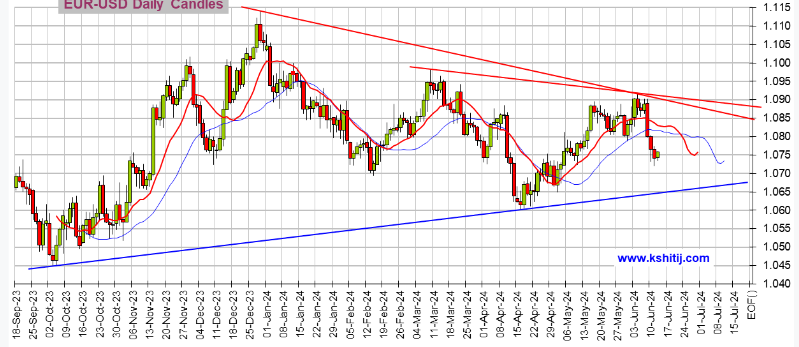 EURUSD는 예상대로 지난 몇 세션 동안 하락. 프랑스 집권당이 EU 선거에서 극우파에 패배하자, 프랑스 대통령 에마뉘엘 마크롱은 지방 의회를 해산하고 조기 선거를 선언. 유로존의 정치적 불확실성으로 인해 유로화는 하락 압력을 받고 있으며, 분석가들은 추가 하락을 예상. 어제 1.0720 테스트 후 회복되었지만, 1.08 이하에서는 1.0700-1.065로의 하락 전망이 계속해서 유지되고 있음.