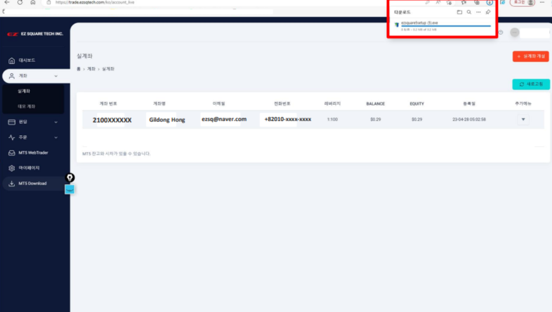 2.우측 상단 인터넷창의 다운로드 파일 누르시고 ezsquare5setup.exe 클릭
