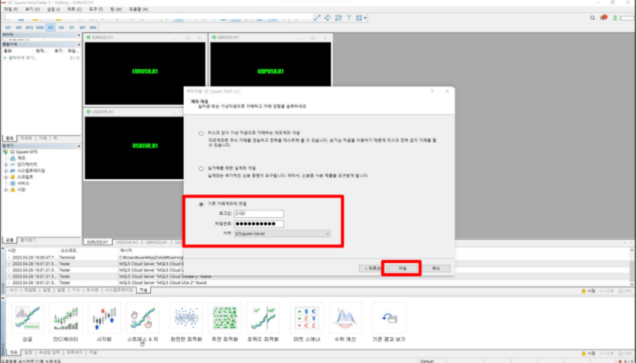 5. 기존 거래계좌에 연결 클릭 메타트레이더 5 실계좌 번호, 비밀번호 입력 이후 마침.