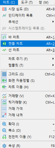 5. 캔들 차트 Alt+2 : 투자자분들이 가장 많이 사용하는 캔들 차트입니다.