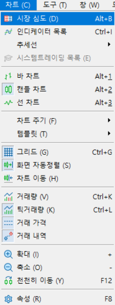 1.시장 심도 (D) Alt+B : 시장 심도는 호가창 거래를 위한 기능입니다.