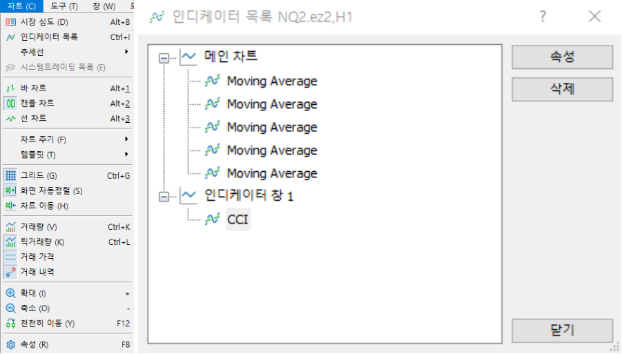 2.인디케이터 (보조지표) 목록 Ctrl+l : 인디케이터 목록은