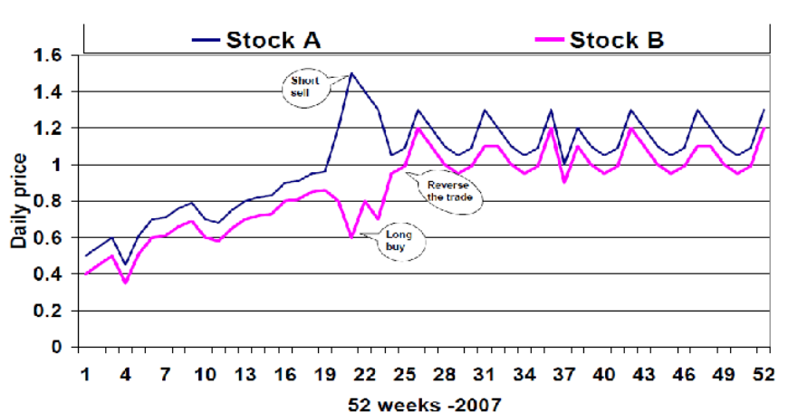 두 개의 상관관계가 높은 자산을 동시에 매수/매도하는 전략입니다. 두 자산의 가격 차이가 벌어질 때 이를 활용하여 이익을 얻는 것이 목적으로 주로 패시브한 트레이더들이 사용합니다.